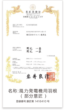 風車が回るときの遠心力で、風車のブレード角を自動変更し、弱風時は低速高トルク、強風時は高速低トルクの風車特性を生じ、暴風時はブレードに作用する風圧でブレード角が最低速角(ブレーキ)となるようブレードの角度を自動で可変する機構を搭載。特許取得